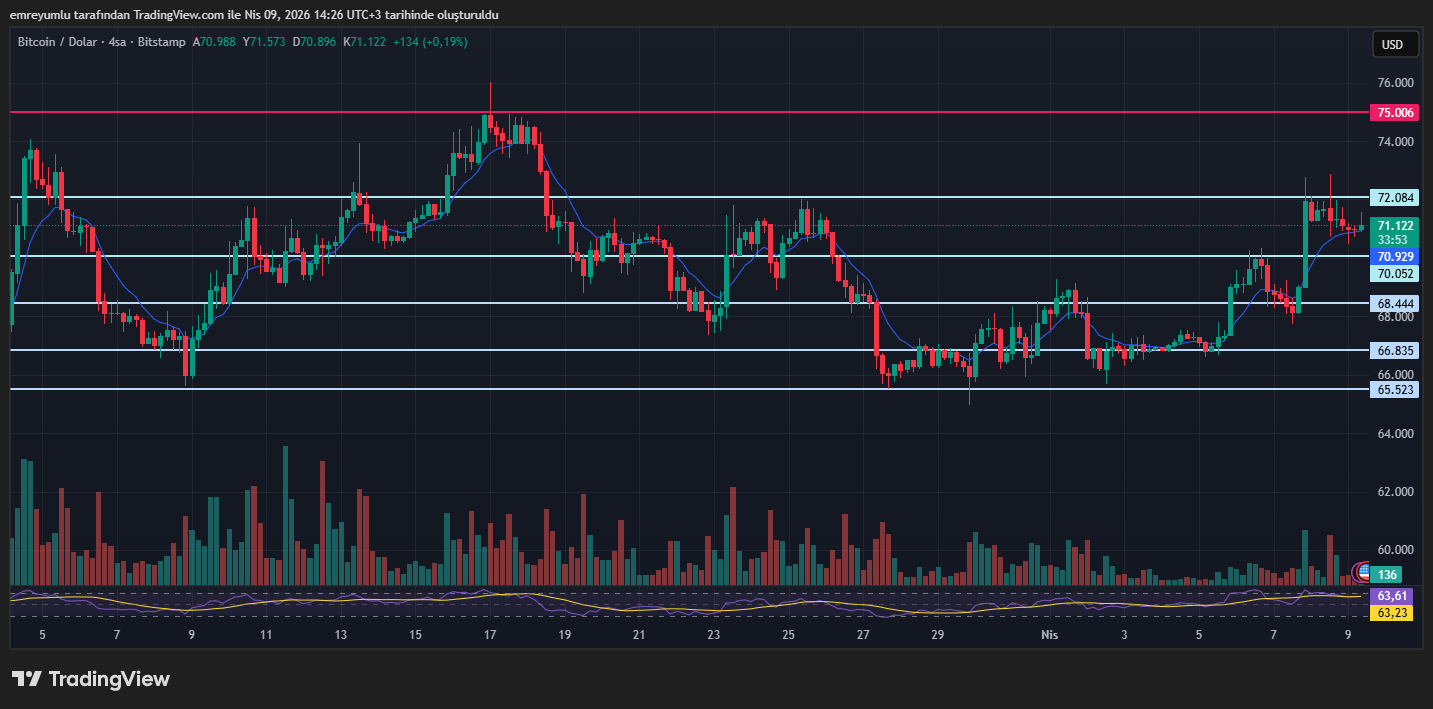 Kripto para piyasasında yön arayışı sürerken, Bitcoin 71.200 dolar seviyesinde yatay hareketini sürdürüyor. ABD-İran ateşkesinin ardından risk iştahında görülen artışa rağmen fiyatın güçlü bir kırılım gerçekleştirememesi, piyasalarda belirsizliğin devam ettiğini gösteriyor.