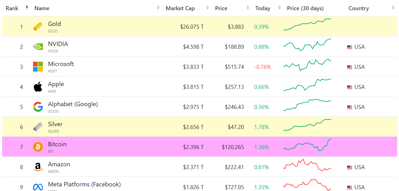 Son verilere göre Amazon’un piyasa değeri 2,371 trilyon dolar seviyesinde bulunuyor. Bitcoin ise bu eşiği aşarak doğrudan Amazon’u geride bıraktı. Yeni tabloda Bitcoin’in önünde yalnızca gümüş (silver) ve diğer geleneksel piyasa devleri yer alıyor.