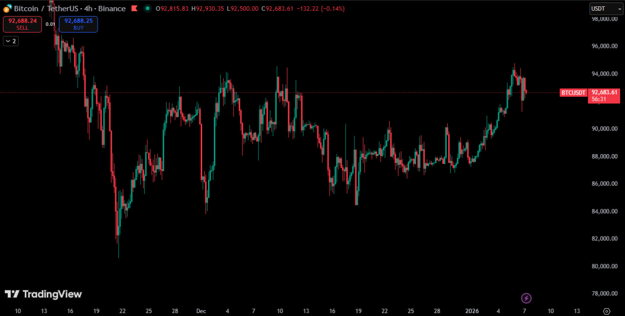 5 Ocak Pazartesi günü Bitcoin, yerel zirvesi olan 94,7 bin dolar seviyesine ulaştı. Zirveye ulaştıktan sonra fiyat, 80,6 bin dolara kadar geri çekilme ihtimaliyle karşı karşıya kaldı. Günün sonunda BTC, yaklaşık %2,40 düşüş yaşayarak 92,5 bin dolar civarında işlem gördü.