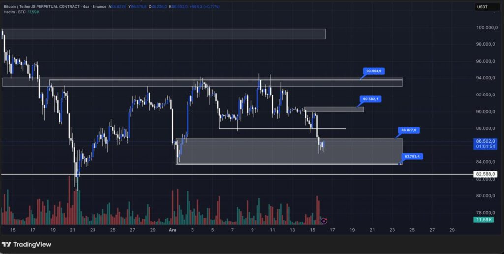 Bitcoin’deki fiyat hareketlerini Coinmühendisi analistimiz sizler için inceledi. Bitcoin, 90.500$ direncini geçemeyerek destek bölgesine geriledi. Mevcut talep bölgesi %3,5 genişliğinde ve 83.800$’a kadar düşüş yaşanabilir. Likidite sağlanırsa dönüş için en güvenli hareket, fiyatın 90.500$ üzerine çıkması olacak. Kısa vadeli trader’lar, daha düşük zaman diliminde oluşan bullish kırılımları takip ederek riskleri azaltabilir.