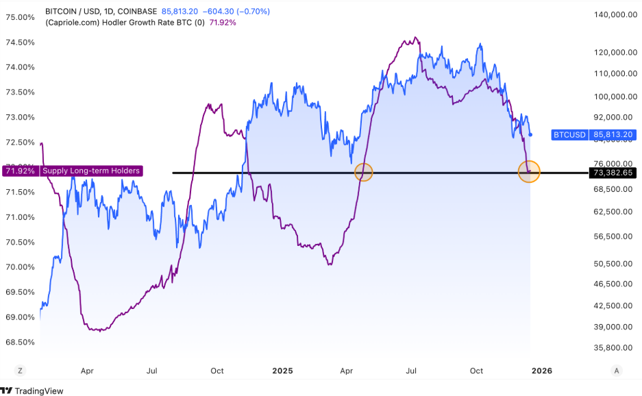 Glassnode verilerine göre, uzun vadeli holder’lar Aralık ayında Bitcoin tutarını 14,8 milyondan 14,3 milyon BTC’ye indirdi. Bu, arzın %71,92’sinin LTH’lerde olduğunu gösteriyor; Nisan ayında benzer seviyeler görüldü. O dönemde Bitcoin $109.000 zirvesinden $74.000’a geriledi. LTH’ler düşük fiyatlarda alım yaparak Temmuz ayında arzlarını %76’ya çıkarmış ve BTC fiyatını $123.000’a yükselten ralliyi tetiklemişti.