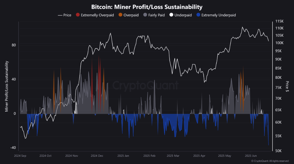 Grafikte görüldüğü gibi, Bitcoin Madenci Kâr/Zarar Sürdürülebilirliği metriği kırmızı alana doğru keskin bir düşüş sergiledi; bu durum, madencilerin gelirlerinin ağ zorluğuna oranla gerilediğini gösteriyor.