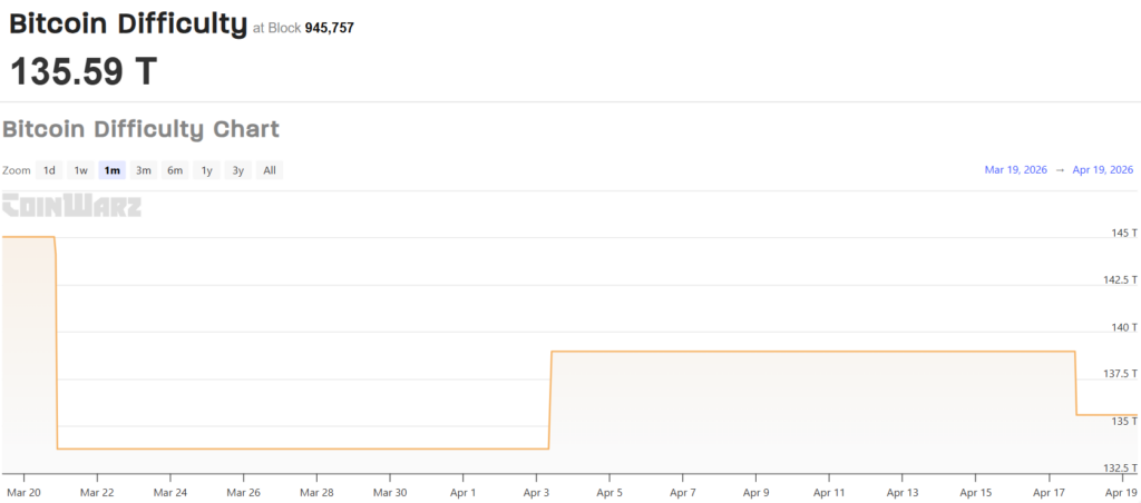 CoinWarz verilerine göre bir sonraki Bitcoin zorluk ayarlamasının 1 Mayıs 2026’da gerçekleşmesi bekleniyor. Bu güncelleme ile ağ zorluğunun 135,59 T seviyesinden 137,43 T seviyesine yükselmesi öngörülüyor.