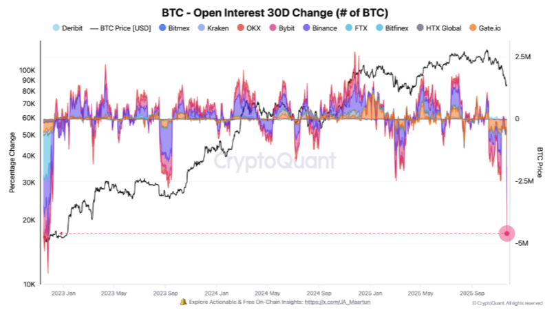 Darkfost, Bitcoin open interest’in son 30 günde bu kadar hızlı düştüğü en son dönemin “2022 ayı piyasası” olduğunu belirterek, mevcut temizlik sürecinin ne kadar önemli olduğunu vurguladı.