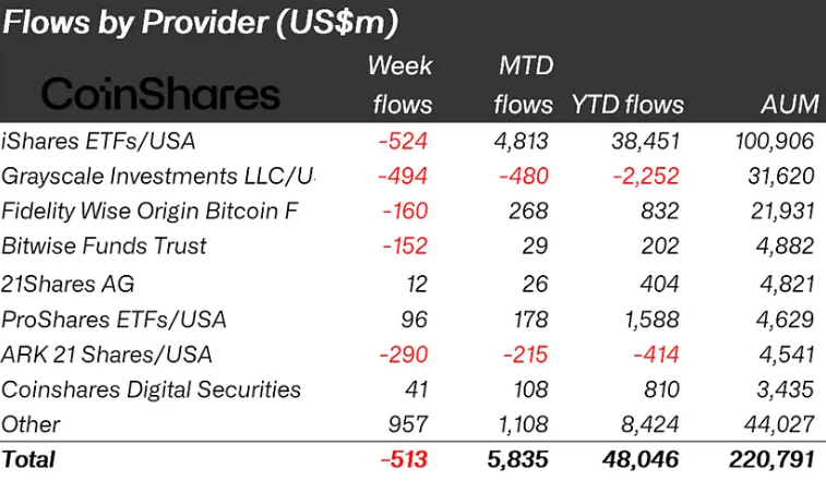 Geçen hafta en çok çıkışı gören varlık Bitcoin oldu ve 946 milyon $ ile listenin başında yer aldı. Yılbaşından bu yana Bitcoin ETP’lerine toplam giriş 29,3 milyar $ ile 2024’ün gerisinde kaldı.