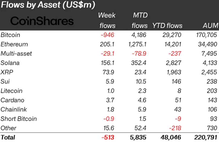 CoinShares raporuna göre, geçtiğimiz hafta dijital varlık piyasasında önemli hareketlilik yaşandı. Bitcoin satan kurumsallar, Ethereum, Solana ve XRP’ye yönelerek ETP çıkışlarını dengeledi.
