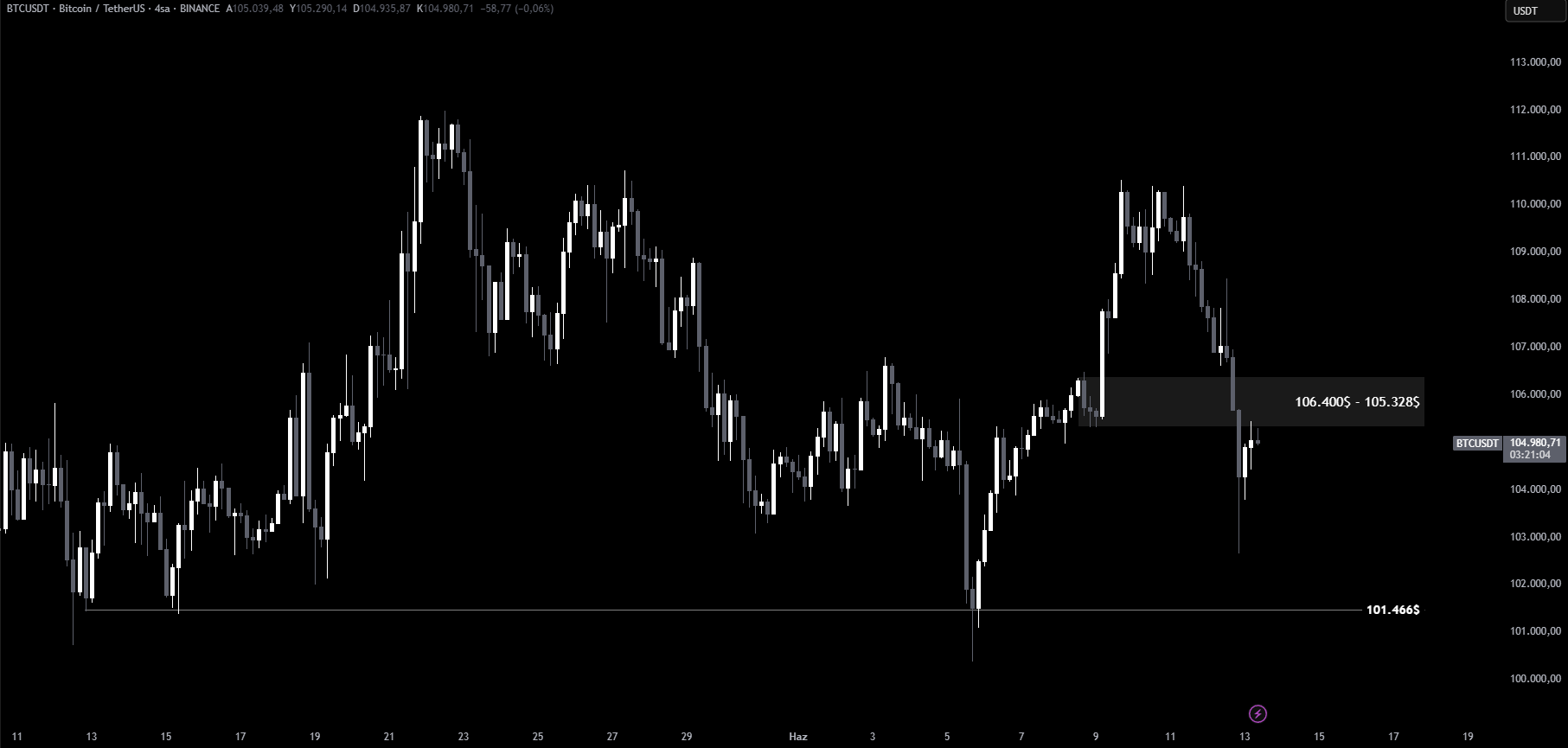 Bu noktada 106.400$ seviyesi üzerine kalıcılık sağlanamazsa, sıradaki destek bölgesi 101.466$ olarak takip edilmeli. Bu seviye, kısa vadeli yön tayini açısından kritik olacak.