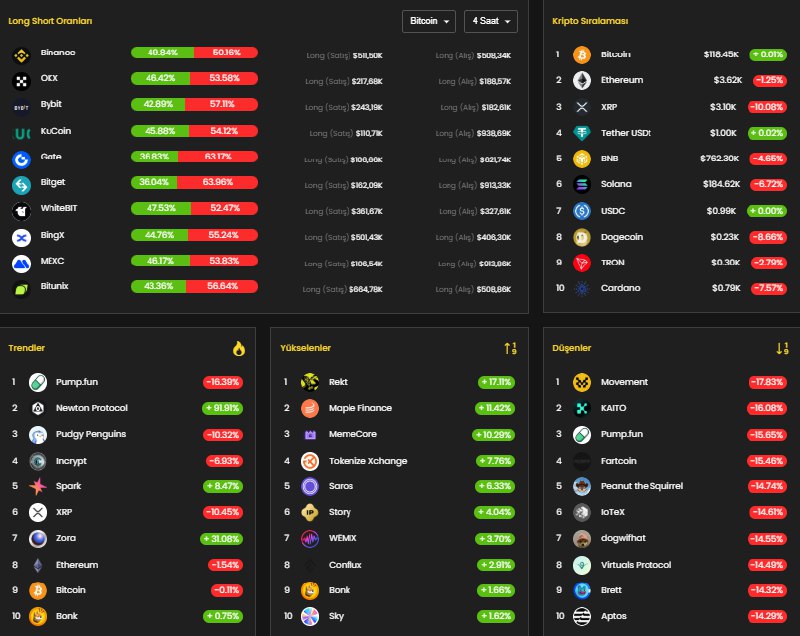 Genel piyasada borsaların long/short oranları short pozisyonların ağırlıkta olduğunu gösteriyor. Bu durum, yatırımcıların düşüş beklentisi içinde olduğunu ortaya koyarken, aynı zamanda çok fazla short pozisyonun birikmesi potansiyel bir dipten dönüş sinyali olabilir. Ancak bu tür metrikler tek başına yeterli değildir. Teknik ve temel analiz araçlarıyla birlikte değerlendirilmelidir.