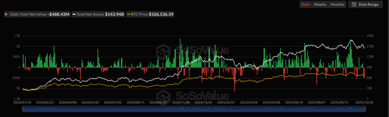 Bitcoin ETF’lerinde yaşanan 488.43 milyon dolarlık çıkış, yatırımcıların kısa vadeli riskten kaçış eğilimini sürdürdüğünü gösteriyor. Bu, Eylül ayından bu yana görülen en yüksek günlük çıkışlardan biri olarak kayıtlara geçti. Özellikle Grayscale Bitcoin Trust (GBTC) ve Fidelity FBTC fonlarından büyük miktarda çıkış gerçekleştiği bildirildi.
