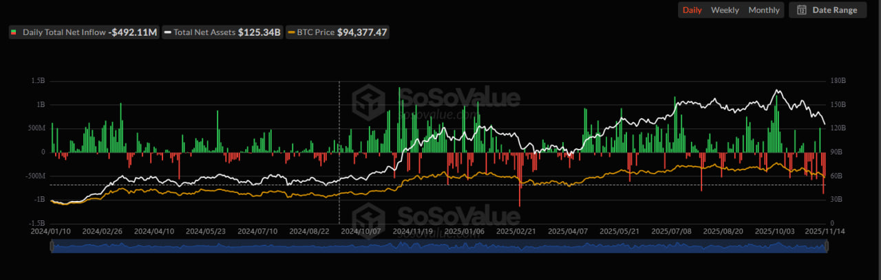 Bitcoin ETF’leri 14 Kasım’da 492.11 milyon dolarlık net çıkış kaydederek üst üste üçüncü çıkış gününü geride bıraktı. Bu rakam, son haftalarda kurumsal talepte yaşanan zayıflığın derinleştiğini ve büyük fonların pozisyonlarını riskli varlıklardan uzaklaştırmaya devam ettiğini gösteriyor. Çıkışların bu seviyede devam etmesi, Bitcoin fiyatı üzerinde doğrudan baskı yaratırken likidite tarafında da kırılgan bir yapının öne çıkmasına neden oluyor. ETF’lerden gelen büyük hacimli itfalar, özellikle ABD piyasalarında riskten kaçınmanın hızlandığını ortaya koyuyor.