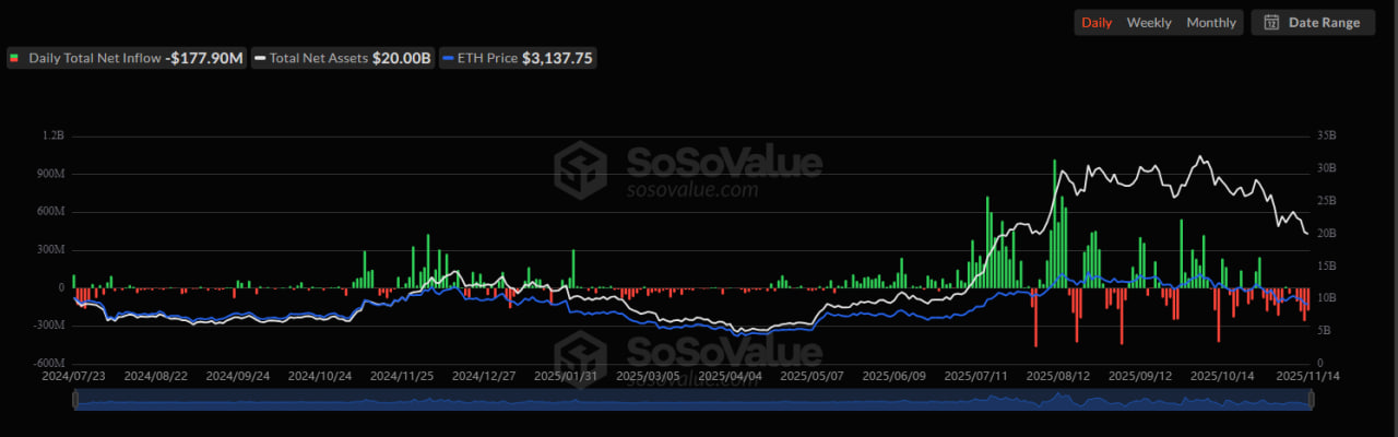 Ethereum ETF’leri de benzer şekilde zayıf performans göstermeye devam etti. ETH ETF’leri 14 Kasım’da 177.90 milyon dolarlık net çıkış kaydederek çıkışlarını üst üste dördüncü güne taşıdı. Ethereum tarafında görülen bu art arda çıkışlar, yatırımcıların ETH fiyatındaki kırılganlık nedeniyle temkinli kalmak istediğini gösteriyor.