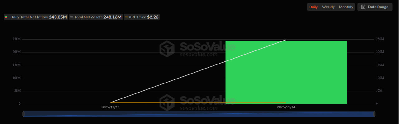 Yeni listelenen XRP ETF’lerinde 13 Kasım gününde net giriş görülmemiş olsa da, ertesi gün 243.05 milyon dolarlık güçlü bir net giriş kaydedildi. Bu giriş hem nakit hem de ayni yoluyla gerçekleştirildi ve ürünün kurumsal yatırımcılar tarafından hızla benimsendiğini gösterdi. Yeni ETF ürünlerinde bu kadar hızlı ve güçlü talep oluşması, piyasanın belirli temalı ürünlere hâlâ yoğun ilgi gösterebildiğinin bir işareti olarak öne çıkıyor.