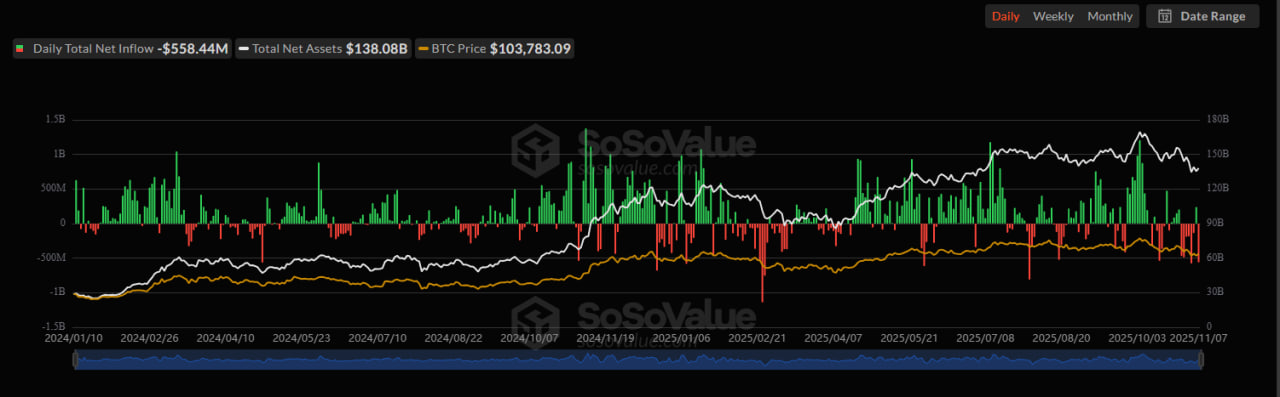 ABD spot Bitcoin ETF’leri, 7 Kasım’da toplam 558,4 milyon dolarlık net çıkış kaydetti. Bu, kripto piyasasında son günlerde gözlenen oynaklığın ve yatırımcıların temkinli pozisyon almasının bir yansıması olarak değerlendiriliyor.
