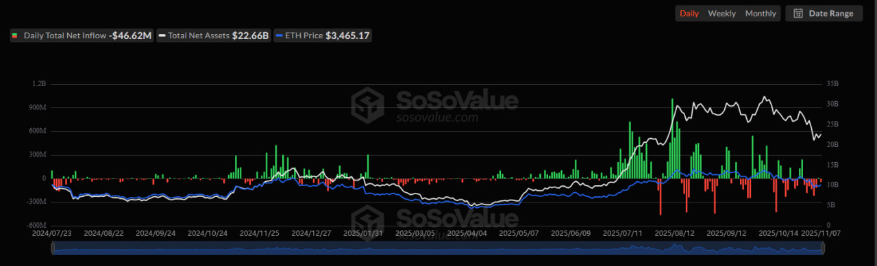 Ethereum ETF’leri, son dönemdeki pozitif akışların ardından yeniden 46,62 milyon dolarlık çıkış kaydetti. ETH fiyatı, haftalık bazda 3.000 dolar seviyesinin üzerinde tutunmakta zorlanırken, yatırımcıların bir kısmı layer-2 çözümleri, staking getirileri ve yaklaşan protokol güncellemeleri nedeniyle uzun vadeli iyimserliğini koruyor.
