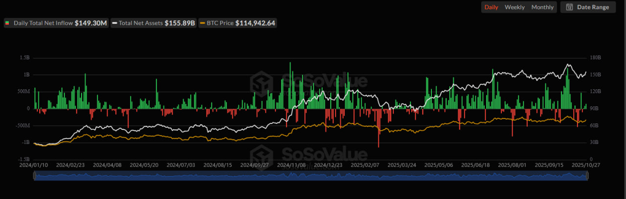 Kripto piyasasında kurumsal fon akışları yeniden ivme kazanıyor. Bitcoin ETF’leri, 27 Ekim günü 149,30 milyon dolar net giriş kaydederek art arda üçüncü gün pozitif yönlü hareket sergiledi.