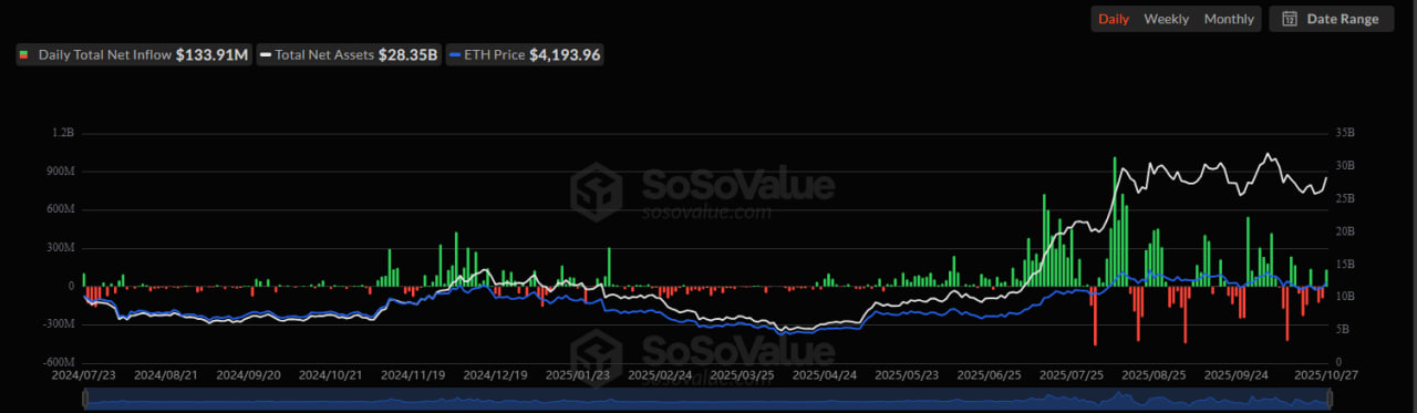 Bitcoin’e paralel şekilde Ethereum ETF’leri de 27 Ekim’de güçlü performans sergiledi. Verilere göre, toplam 133,91 milyon dolar net giriş kaydedildi ve dokuz fonun tamamında çıkış yaşanmadı.