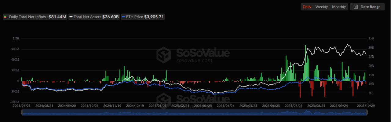 Ethereum cephesinde de tablo farklı değildi. Spot Ethereum ETF’leri, 29 Ekim itibarıyla toplam 81,44 milyon dolar net çıkış bildirdi. Yatırımcıların özellikle son haftalarda ETH fiyatındaki zayıf performans nedeniyle fonlardan çıkış eğilimi gösterdiği belirtiliyor. Ancak BlackRock’ın ETHA fonu, günün tek pozitif ayrışanı olarak küçük bir net giriş kaydetti. Bu durum, bazı kurumsal yatırımcıların Ethereum ekosistemine yönelik uzun vadeli stratejik pozisyonlarını koruduğunu gösteriyor.