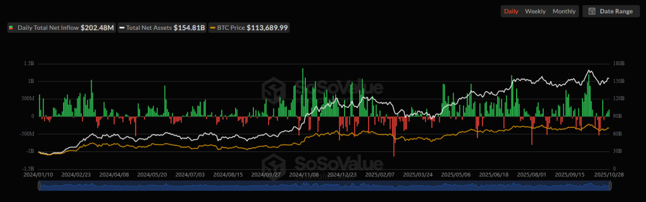 Bitcoin ETF’leri, 28 Ekim’de toplam 202,48 milyon dolar net giriş elde ederek üst üste dördüncü gün pozitif fon akışı kaydetti. Bu, kurumsal yatırımcıların Bitcoin’i yeniden “güvenli dijital varlık” olarak gördüğünü ve piyasanın toparlanma sinyalleri verdiğini ortaya koyuyor.