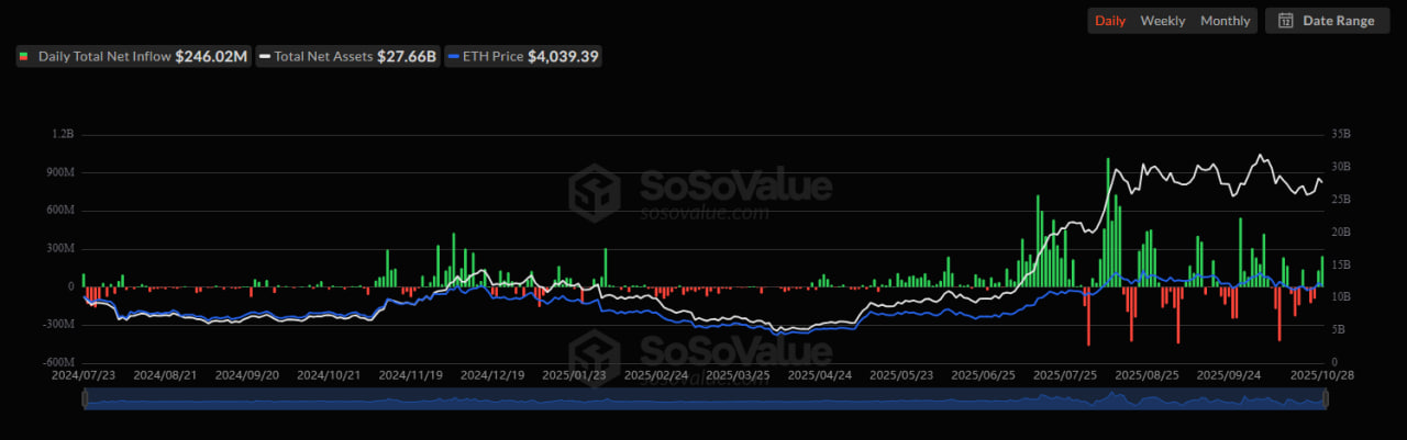 Ethereum ETF’leri, 28 Ekim’de toplam 246,02 milyon dolar net girişle güçlü bir performans sergiledi. Bu rakam, son haftalarda Ethereum’a yönelik kurumsal ilginin hızla arttığını ve “smart contract” tabanlı varlıkların yeniden ön plana çıktığını gösteriyor.