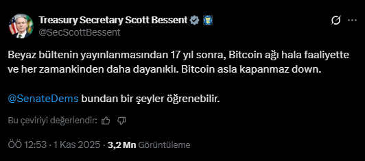 Bitcoin, 2008’de yalnızca bir fikir olarak ortaya çıkmıştı. Bugün ise, dünyanın en güvenilir ve kesintisiz çalışan ağlarından biri haline geldi. Scott Bessent’in sözleri, hem bu dayanıklılığa hem de Bitcoin’in artık politik ve ekonomik tartışmaların merkezine oturduğuna işaret ediyor.