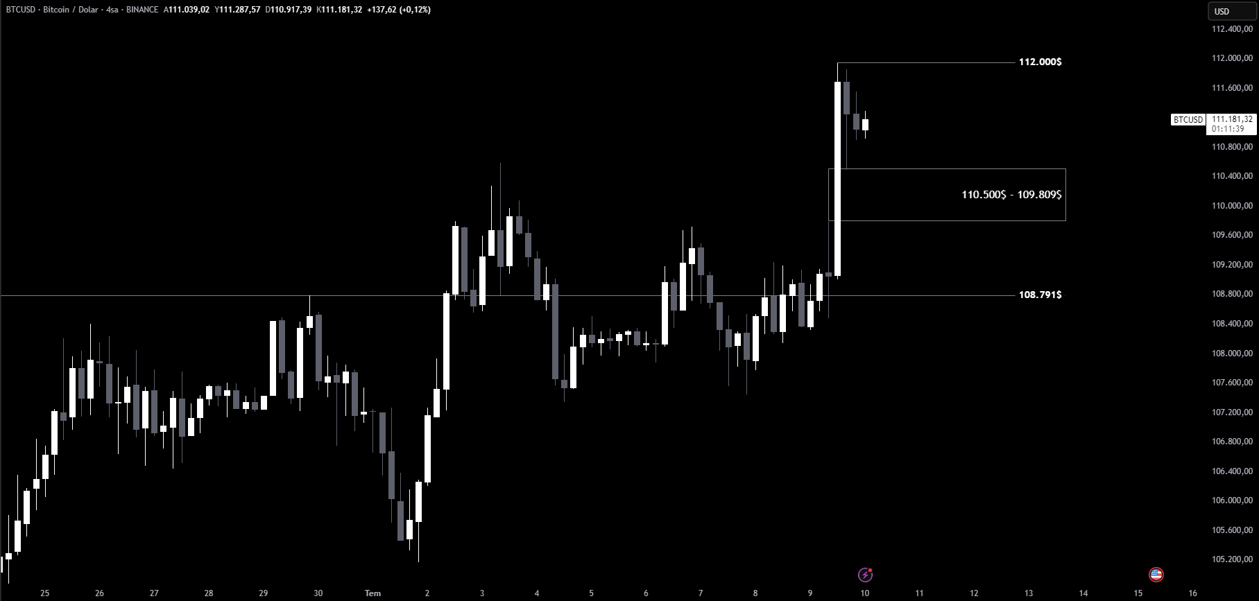 Öte yandan yükselişin devam edebilmesi için aşılması gereken önemli bir bariyer bulunuyor: 112.000$ seviyesi. Bu direnç, hem psikolojik hem teknik olarak güçlü bir bölge. Kırılması, yeni zirvelerin önünü açabilir. Aksi senaryoda ise fiyat, FVG bölgesine geri çekilerek dengelenme sürecine girebilir.