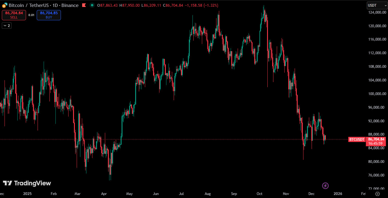 Dünyanın en büyük kripto para birimi Bitcoin (BTC), tarihinde dördüncü kez yılı kayıpla kapatmaya hazırlanıyor. Ancak yatırımcıları asıl endişelendiren düşüşün kendisi değil; bu düşüşün devasa bir skandal veya çöküş olmadan, tüm “olumlu” gelişmelere rağmen gerçekleşiyor olması.