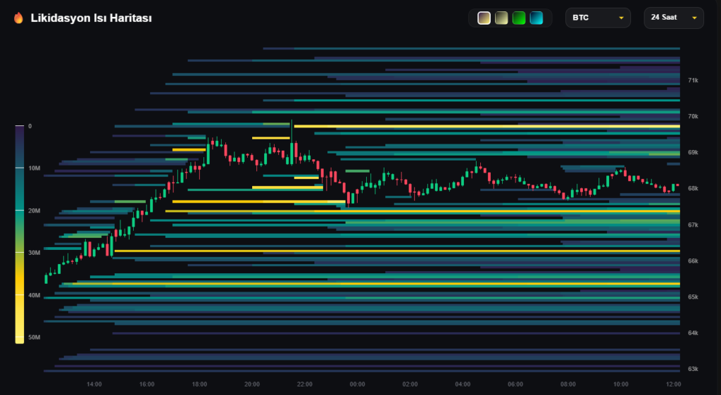CoinGlass verilerine göre Bitcoin, 70.000 dolar civarındaki likiditeyi test etti ancak asıl yoğun emir kümesi mevcut fiyatın üzerinde bulunuyor. Yaklaşık 2 milyar dolarlık satış emri 72.450–75.000 dolar aralığında yer alıyor.
