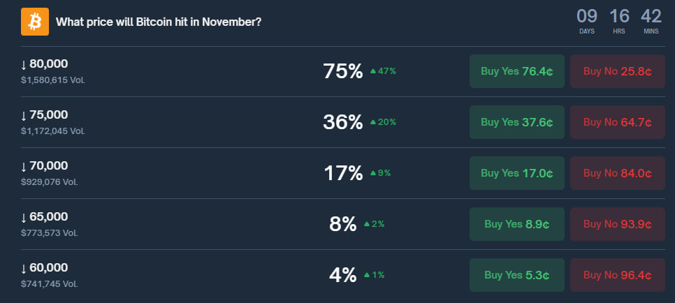 Tahmin piyasaları, kripto sektöründeki volatilite artarken yatırımcıların geleceğe yönelik beklentilerini gerçek zamanlı olarak yansıtmaya devam ediyor. Polymarket verilerine göre Bitcoin’in Kasım ayına kadar 80.000 dolar seviyesine gerileme olasılığı %75 olarak fiyatlanıyor. Bu oran, piyasalardaki mevcut risk algısının ve yatırımcı duygusunun önemli bir göstergesi olarak değerlendiriliyor.