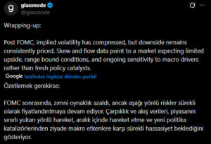 Glassnode ayrıca zımni volatilitenin düşüş eğilimine girdiğine dikkat çekti. Şirkete göre yılın son büyük makro gündem maddesi olan FOMC toplantısının ardından, tarihsel olarak volatilite daha da sıkışıyor.