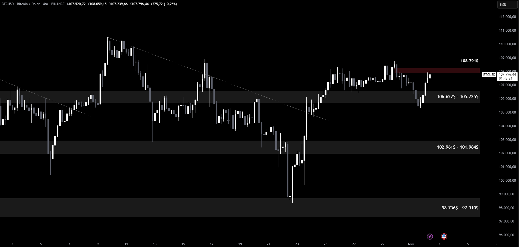 4-saatlik grafikte, BTC için 108.791 dolar seviyesi oldukça kritik bir direnç olarak öne çıkıyor. Aynı zamanda bu seviyeye denk gelen kırmızı kutu bölgesi de teknik açıdan önem taşıyor. Eğer fiyat bu seviyelerin üzerinde kapanışlar yaparsa, yeni bir ATH (All-Time High) ihtimali masaya gelebilir. Bu da piyasada ciddi bir trend değişimi anlamına gelir.