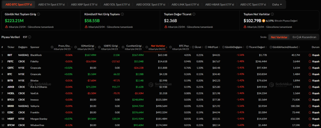 Nisan ayında spot Bitcoin ETF’lerine toplam 2,03 milyar dolarlık giriş gerçekleşti. Bu akış, özellikle 68.000–70.000 dolar bandında güçlü bir destek zemini oluşturdu.