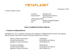 Japonya’nın önde gelen Bitcoin hazine şirketi Metaplanet, 16,48 milyar Japon yeni (yaklaşık 112 milyon dolar) karşılığında 1.009 BTC satın aldığını duyurdu. Bu son alımla birlikte şirketin toplam Bitcoin varlıkları 20.000 BTC seviyesine ulaştı.