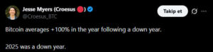 Smarter Web Company’nin Bitcoin Stratejisi Başkanı Jesse Myers, Bitcoin’in geçmiş döngülerine dikkat çekerek önemli bir tarihsel modele işaret etti. Myers’a göre Bitcoin, yıllık bazda negatif kapattığı dönemlerin ardından genellikle güçlü yükselişler sergiliyor.