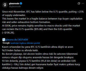 On-chain analiz platformu Glassnode, Bitcoin’in kasım ayı ortasından bu yana 0,75 Fibonacci geri çekilme seviyesinin altında işlem gördüğünü bildirdi. Bu seviyenin altında gerçekleşen hareket, toplam arzın yüzde yirmi beşten fazlasının şu anda zararda olduğunu gösteriyor. Analistlere göre bu tablo, piyasada kırılgan bir denge oluştuğuna işaret ediyor ve fiyat hareketlerinin daha duyarlı bir yapıya büründüğünü ortaya koyuyor. Bu durum, özellikle belirsizlik dönemlerinde fiyatın daha keskin tepkiler verme olasılığını artırıyor.