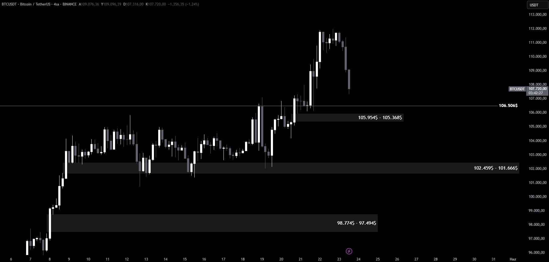 Analizlere göre, 4 saatlik grafikte Bitcoin, 106.506$ seviyesinin altında kalıcı olursa, aşağı yönlü baskı artabilir. Özellikle 105.954$ – 105.368$ bandı, fiyatın yukarı yönlü ivmesini koruması için hayati öneme sahip. Bu aralık kaybedilirse, Bitcoin’de daha derin bir geri çekilme gündeme gelebilir.