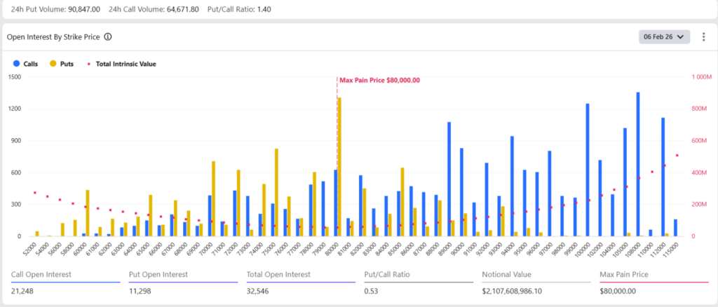 6 Şubat’ta Deribit’te 32.000’den fazla BTC opsiyonunun vadesi doldu. 2,1 milyar dolarlık nominal değerle opsiyon piyasasında yoğun volatilite oluştu. Put opsiyon hacmi call’ı aşarak düşüş yönlü baskıyı artırdı; BTC’nin zımni oynaklığı saatler içinde 90’dan 69’a geriledi.