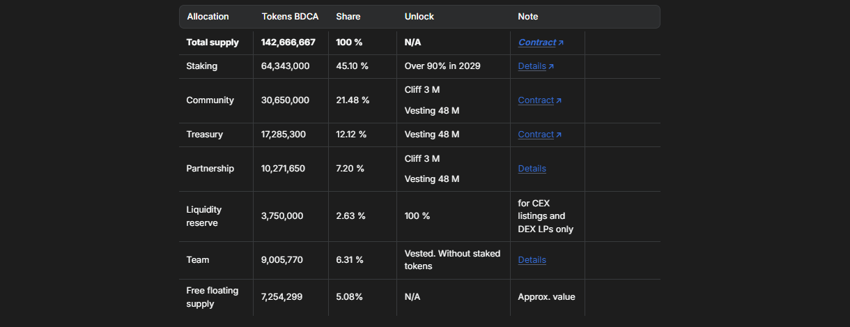 $BDCA token’ı, platformun temel yardımcı token’ıdır ve toplam arzı 142.666.667 adettir. Token dağıtımı şu şekildedir: