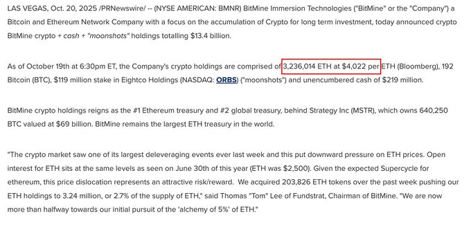 BitMine Immersion Technologies (NYSE: BMNR), geçtiğimiz hafta yaklaşık 203.800 Ethereum (ETH) satın aldığını açıkladı. Bu alımla birlikte şirketin toplam kripto ve nakit varlıkları 1,34 milyar dolar seviyesine yükseldi.
