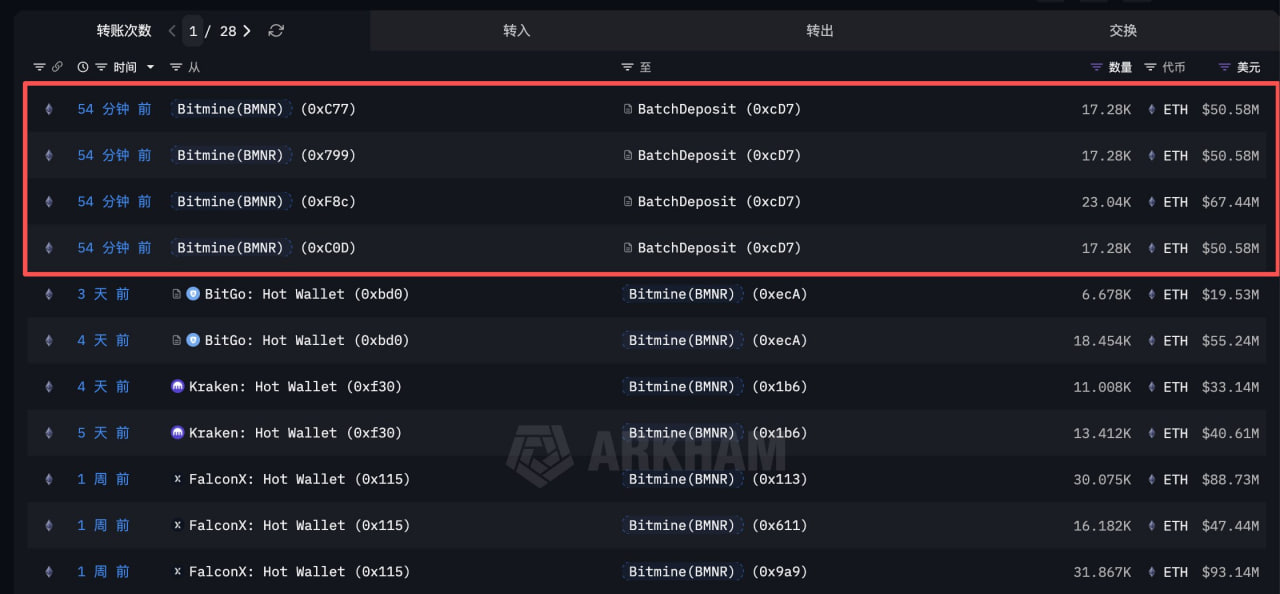Onchain analiz platformu Arkham’ın verilerine göre, Bitmine ile bağlantılı birden fazla cüzdan pazar günü “BatchDeposit” isimli sözleşmeye büyük miktarda ETH transferi gerçekleştirdi. Toplamda 74.880 ETH’lik bu transferler, genellikle validator kurulumu öncesinde tercih edilen kurumsal staking modelleriyle örtüşüyor.
