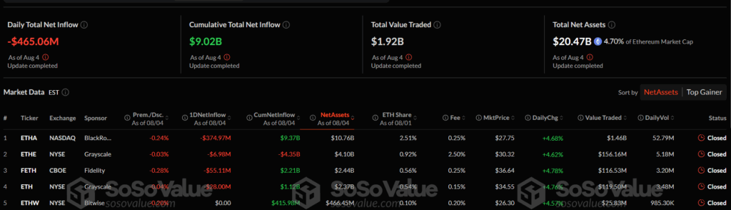 ABD’de listelenen spot Bitcoin ve Ethereum ETF’leri, 4 Ağustos 2025 itibarıyla toplam 787 milyon dolarlık net çıkış yaşadı. Spot Bitcoin ETF’lerinden 322 milyon dolar çıkış gerçekleşirken, spot Ethereum ETF’leri 465 milyon dolarlık sermaye kaybı verdi.