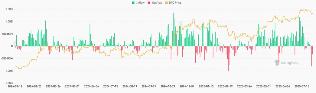 Bitcoin, 14 Temmuz’da ulaştığı 114.278 dolarlık zirveden bu yana değer kaybetti. Hafta sonunda %8,5 düşüş yaşayan BTC, 112.300 dolara kadar geriledi. Pazartesi günü geç saatlerde ise 115.000 dolar seviyelerine toparlandı. Ancak bu toparlanma, ETF’lerdeki çıkışı durduramadı.