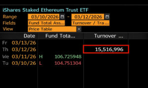 BlackRock’un staking özellikli Ethereum ETF’i ETHB, Nasdaq’taki ilk işlem gününde yaklaşık 15,5 milyon dolarlık işlem hacmine ulaştı. Bu rakam, yeni ürünün piyasaya güçlü bir başlangıç yaptığını ve yatırımcıların staking özellikli kripto ETF’lerine ilgi gösterdiğini ortaya koyuyor.