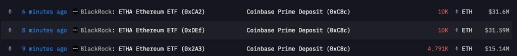 Zincir üstü verilere (On-chain data) göre, dünyanın en büyük varlık yöneticisi BlackRock, önemli miktarda Ethereum‘u (ETH) kurumsal kripto para saklama ve alım satım platformu Coinbase Prime adreslerine transfer etti.