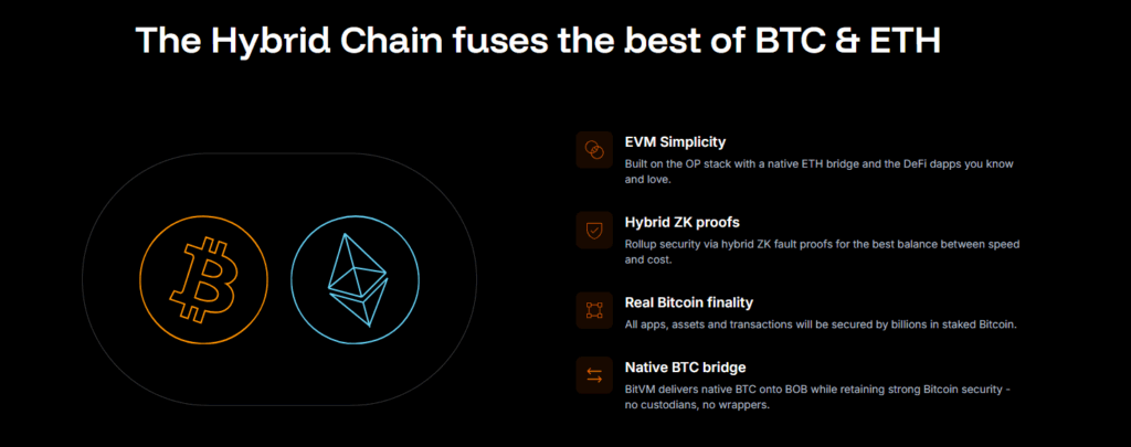 BOB, hibrit zincir yapısı sayesinde Bitcoin’in güvenliğini ve Ethereum’un esnekliğini birleştirir. BitVM köprüleri sayesinde kullanıcılar, BTC’lerini tek işlemle DeFi uygulamalarına yatırabilir, stake edebilir veya diğer varlıklara çevirebilir. Hibrit zincir modeli, hem Bitcoin hem Ethereum ağları tarafından doğrulanan işlemler sunar.