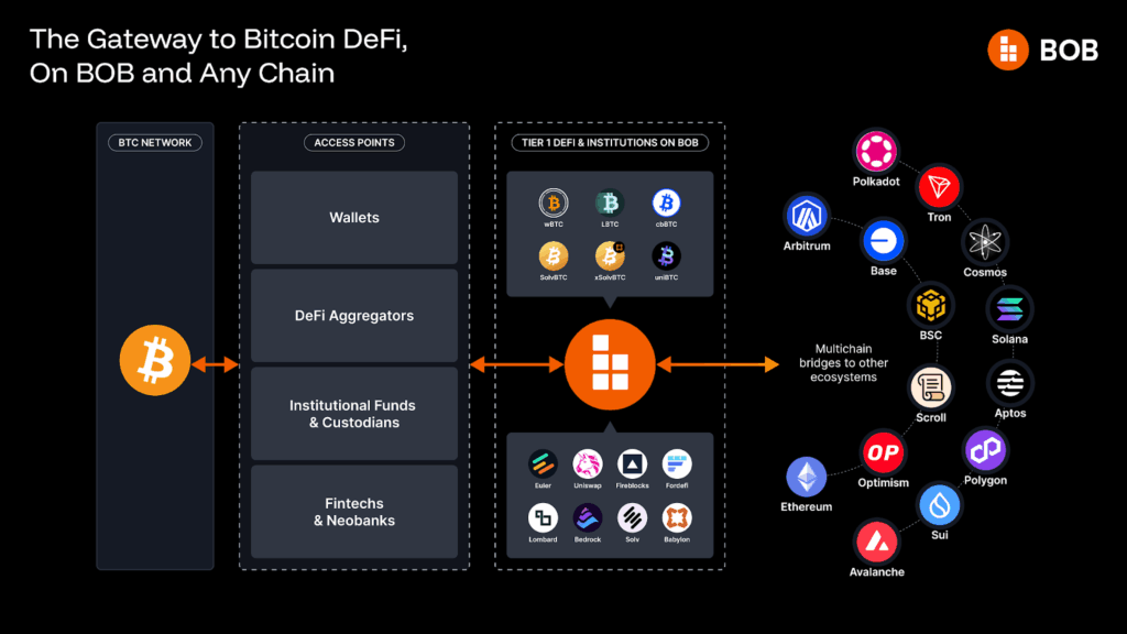 BOB ekosistemi, Uniswap, Euler, Aave, LiFi, Lombard, Chainlink, Babylon ve Solv gibi tier 1 DeFi protokollerini kapsamaktadır. Kurumsal partnerler arasında Fireblocks, Cobo ve ForDeFi yer almakta olup ekosistem hızla büyümektedir.