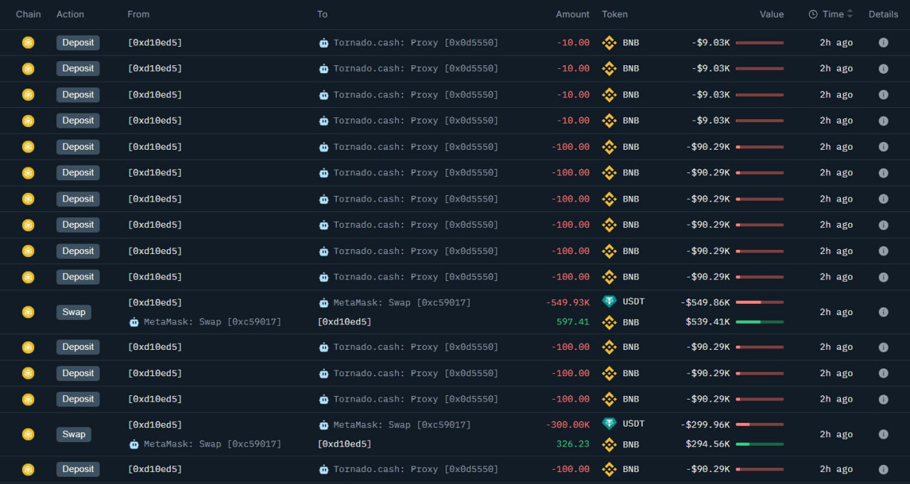 Elde ettiği fonların ilk kısmı 1.140 BNB şeklinde belirlendi. Bu miktarın o anki değeri yaklaşık 1,04 milyon dolara karşılık geliyordu. Saldırgan bu BNB’leri hızlıca Tornado Cash üzerinde karıştırdı. Bu tür karıştırıcılar fonların izini takip etmeyi neredeyse imkânsız hale getirdiği için hack vakalarında sıkça kullanılıyor. Saldırganın bu aşamada BNB Chain’den uzaklaşmak istemesi, BSC üzerindeki iz takibini zorlaştırmak için klasik ama etkili bir strateji olarak biliniyor.