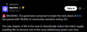 Injective ekosisteminde gerçekleştirilen son yönetişim oylaması, INJ token arzını azaltmayı hedefleyen yeni bir deflasyonist sürecin resmen başlatılmasını onayladı. Neredeyse tüm katılımcıların desteğini alan bu teklif, topluluk mutabakatının ne kadar güçlü olduğunu ortaya koyarken, Injective’in token ekonomisinde uzun vadeli, kalıcı ve daha disiplinli bir yapısal dönüşüme işaret ediyor.