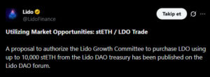 Lido DAO bünyesinde faaliyet gösteren Büyüme Komitesi, DAO hazinesinde bulunan stETH varlıklarının bir kısmını kullanarak LDO token biriktirmeyi hedefleyen yeni bir teklif sundu. Bu teklif, yalnızca kısa vadeli fiyat hareketlerine tepki vermek değil, aynı zamanda uzun vadeli değer yaratımını desteklemek amacı taşıyor. Teklife göre uygun piyasa koşullarının devam etmesi halinde en fazla 10.000 stETH kullanılarak LDO alımı gerçekleştirilecek. Sürecin operasyonel yönetimi ise Lido Ecosystem Foundation tarafından üstlenilecek. Satın alınan LDO tokenlerinin yeniden DAO hazinesine aktarılması planlanırken, süreç sonunda şeffaflık adına detaylı bir rapor paylaşılması da gündemde.