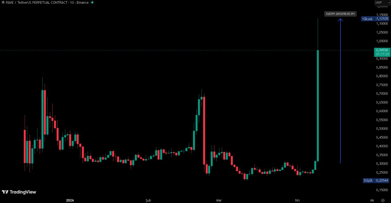 Kripto para piyasasında dikkat çeken hareketlerden biri RaveDAO tokenında yaşandı. Son 24 saat içerisinde yaklaşık 3,5 kat değer kazanan RAVE, 0,20 dolar seviyelerinden 1,13 dolara kadar yükseldi. Fiyat, bu sert rallinin ardından anlık olarak 0,98 dolar civarında dengelenmiş durumda.