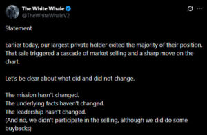 WhiteWhale yetkilileri, yaşanan sert fiyat hareketinin ardından resmi X hesapları üzerinden bir açıklama yayımladı. Açıklamada, piyasada görülen yoğun satış dalgasının proje hazinesi veya ekip kaynaklı olmadığı, bunun yerine beklenmedik bir “likidite olayı” sonucu ortaya çıktığı özellikle vurgulandı. Ekip, söz konusu satışların kontrol dışı geliştiğini ve proje içinden organize bir dump işlemi yapılmadığını belirtti.